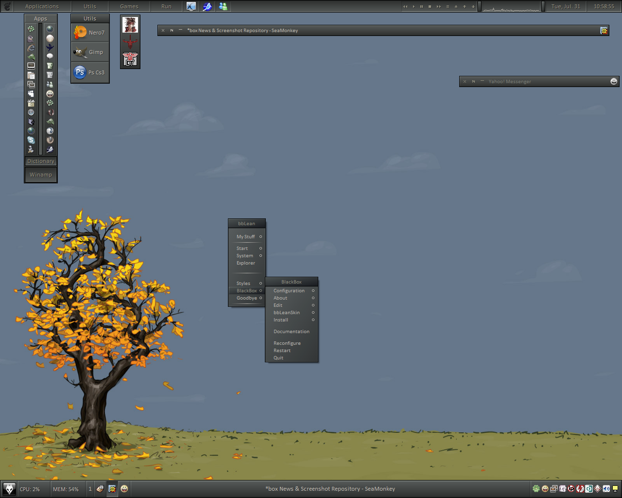 | Nice looking style dpcdpc11, good looking menu. I'm not real crazy about the wall, I think the style would look better with a pic or a bsetroot bg that has a more 3D feel too it as the 'flat' look of the wall seems somewhat out of place - the colors work nicely tho... Maybe it's just me. |